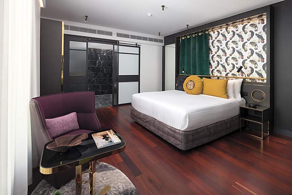 This double room has a deep soaking bath and rainshower, double vanity, seating area and windows that open. Also featured is an LCD flat-screen HDTV, speaker and air conditioning as well as a coffee machine with coffee pods and tea.